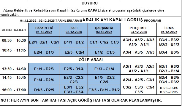 Adana Rehberlik ve Rehabilitasyon Kapalı İnfaz Kurumu KAPALI görüş programı aşağıdaki çizelgeye göre yapılacaktır.