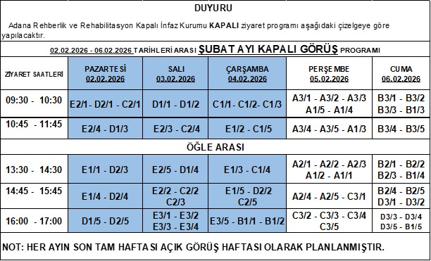 Adana Rehberlik ve Rehabilitasyon Kapalı İnfaz Kurumu KAPALI görüş programı aşağıdaki çizelgeye göre yapılacaktır.