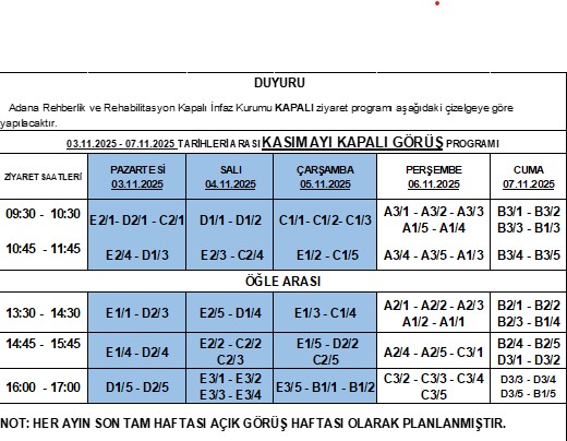 Adana Rehberlik ve Rehabilitasyon Kapalı İnfaz Kurumu KAPALI görüş programı aşağıdaki çizelgeye göre yapılacaktır.
