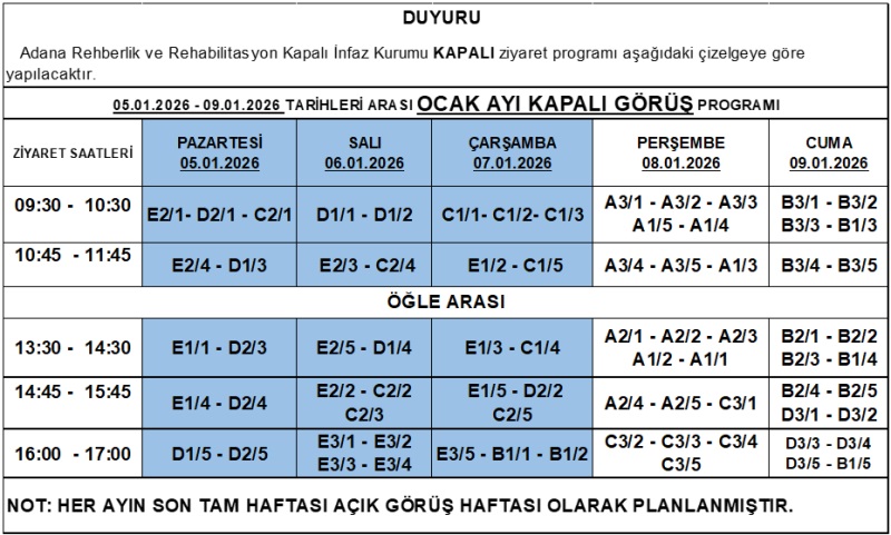 Adana Rehberlik ve Rehabilitasyon Kapalı İnfaz Kurumu KAPALI görüş programı aşağıdaki çizelgeye göre yapılacaktır.