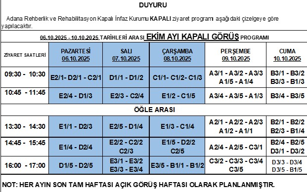Adana Rehberlik ve Rehabilitasyon Kapalı İnfaz Kurumu KAPALI görüş programı aşağıdaki çizelgeye göre yapılacaktır.