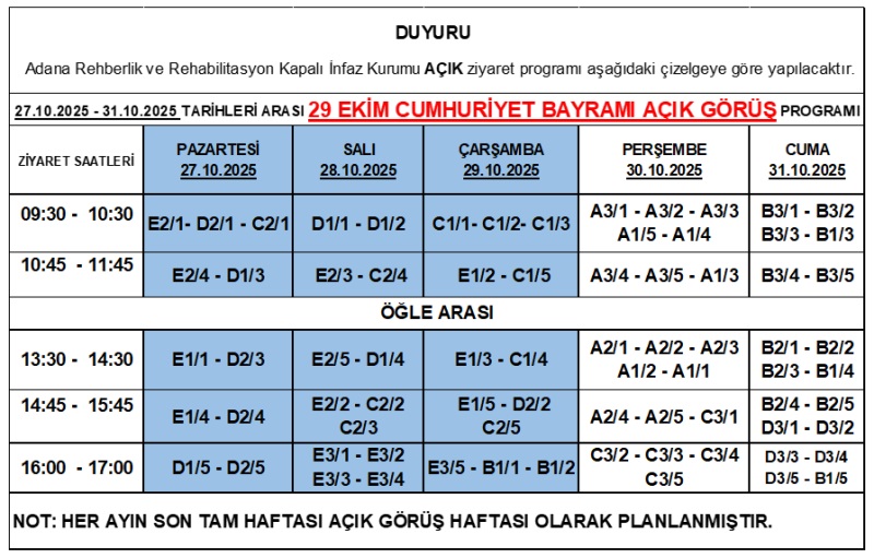 Adana Rehberlik ve Rehabilitasyon Kapalı İnfaz Kurumu AÇIK görüş programı aşağıdaki çizelgeye göre yapılacaktır.