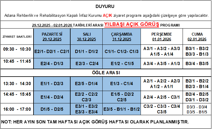 Adana Rehberlik ve Rehabilitasyon Kapalı İnfaz Kurumu AÇIK görüş programı aşağıdaki çizelgeye göre yapılacaktır.